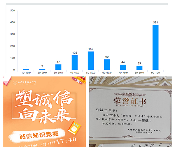 以“塑诚信,向未来”为主题,通过以赛促学的方式,进行线上诚信知识竞赛,866名同学经过公平、公正角逐,248名同学获得满分的成绩。知识竞赛进一步强化了诚信知识的宣传效果,达到了以赛促学、以赛育人的目的。