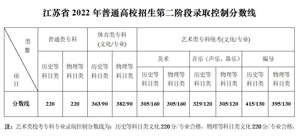 江苏省2022年普通高校招生第二阶段录取控制分数线