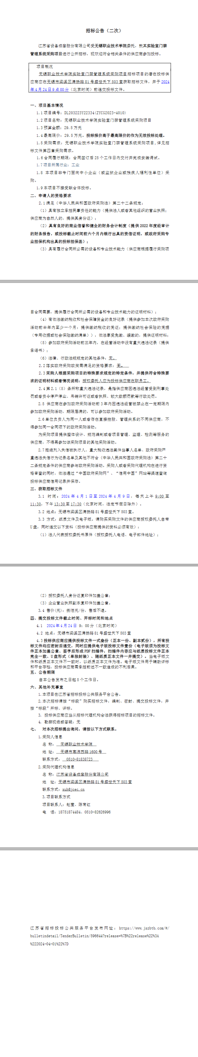 无锡职业技术学院实验室门禁管理系统采购项目招标公告(二次)