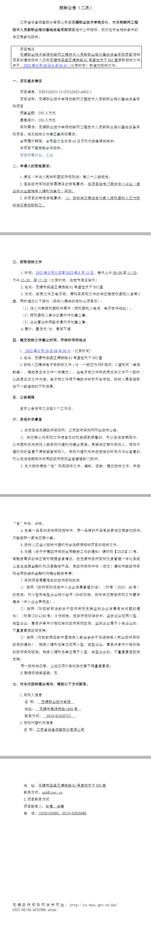 无锡职业技术学院物联网工程技术人员新职业培训基地设备采购项目的公开招标公告(二次) 发布时间:2023-08-08 09:00:00