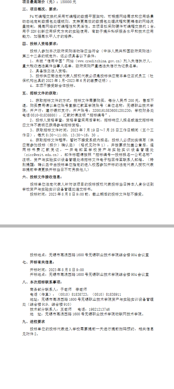 无锡职业技术学院物联网技术学院硬件可编程交换机采购项目(ZB-202307-012)采购公告 发布时间:2023-07-18 14:10:25
