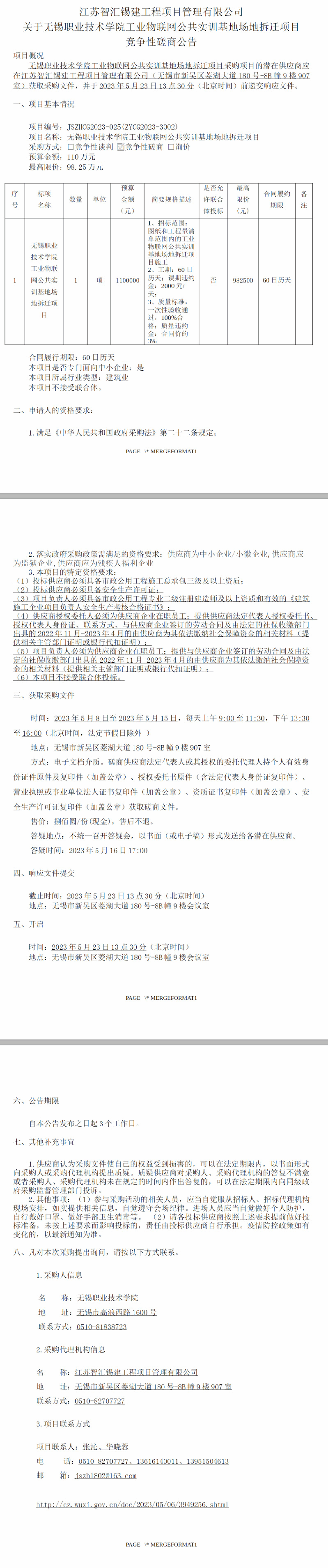 无锡职业技术学院工业物联网公共实训基地场地拆迁项目(CS20230003)采购公告 发布时间:2023-05-06 12:06:51阅读量:792 次