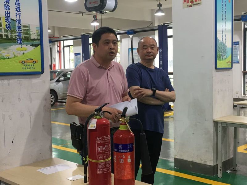疏散演练结束后,汽车与交通学院师生在工业中心B楼一楼集合点进行点评和总结,指挥人员引导实验实训室专职管理人员前往工业中心东侧空旷场地进行灭火演练,相关管理人员现场使用灭火器扑灭预设火源。