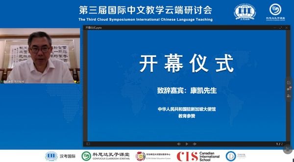研讨会分设主题大会与教学工作坊,吸引了来自五大洲20个国家近600名国际中文教师齐聚云端。中国驻新加坡大使馆教育参赞康凯先生为大会开幕致辞,康凯参赞以24节气中谷雨的来历与联合国“中文日”的设立开篇,讲述了中文之形态美、结构美、韵律美及中文的历史与文化传承,倡导从事国际中文教育工作的教师、专家和学者们团结起来,共同推动国际中文事业不断向前发展,