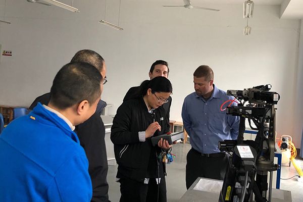 代表团一行对我校的热情接待表示感谢,并与我校教师代表就自动化控制技术专业中美合作办学项目的课程体系进行了深入讨论,提出了建设性意见,并达成了诸多共识。在师生交流会上,我校教师代表介绍了项目学生的课程学习情况,福克斯谷技术学院教师代表了解了学生英语、专业学习状况,学生代表畅谈了学习感受。代表团还参观了我校智能制造中心和自动化控制技术学院实训室,并走访校企合作单位无锡埃姆维工业控制设备有限公司,代表团对我校的教学实训设施、项目整体安排给予高度评价并对两校专业合作充满信心。