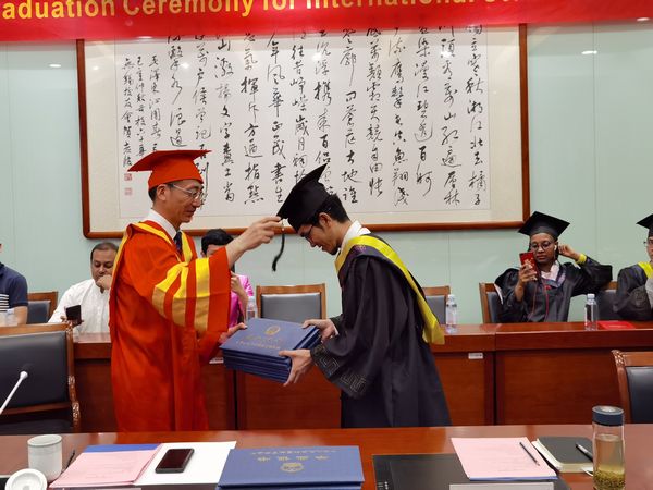 龚方红校长在毕业贺词中向2020届毕业生顺利完成学业表示祝贺,向身在海外的留学生同学表达了慰问,并鼓励同学们无论遇到何种困难都要乐观积极,用所学的知识与技能为自己国家的发展作出贡献,努力成为国际友好传播使者,促进中外文化交流。印尼特里萨克迪集团主席Bimo先生、印尼特里萨克迪旅游学院校长Fatty女士、印尼特里萨克迪物流交通大学副校长Juliater Simarmata先生分别代表海外合作高校对顺利完成学业的跨国分段联合培养本科毕业生表示祝贺,他们高度认可我校的外国留学生培养工作,并就进一步加深与我校稳固的合作表达了意愿。优秀毕业生代表、教师代表、家长代表表达了对母校、老师和同学们的不舍与感谢,龚方红校长身着学位服为毕业生代表行拨穗礼、颁发毕业证书、并合影留念。