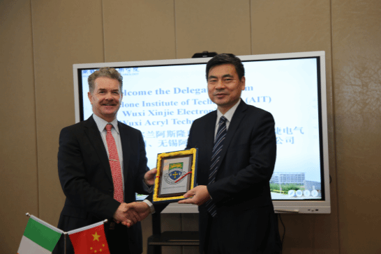 15日,爱尔兰阿斯隆理工学院校长卡荣•欧•凯恩校长、无锡阿科力科技股份有限公司董事长朱学军、无锡信捷电气股份有限公司董事长李新等一行11人考察访问我校。校领导朱爱胜、龚方红及党院办、国际交流合作处、控制技术学院等相关部门和学院负责人接待了访问团一行。