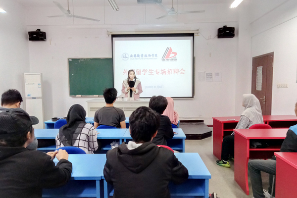 为提升服务“一带一路”水平,助力中国企业走出去,服务2019届外国留学生高质量充分就业和中资企业人才需求,国际教育学院联合江苏德龙镍业有限公司于11月6日下午举办了2019届外国留学生专场校园招聘会,20余名外国留学生聆听了企业宣讲并参加了现场面试。