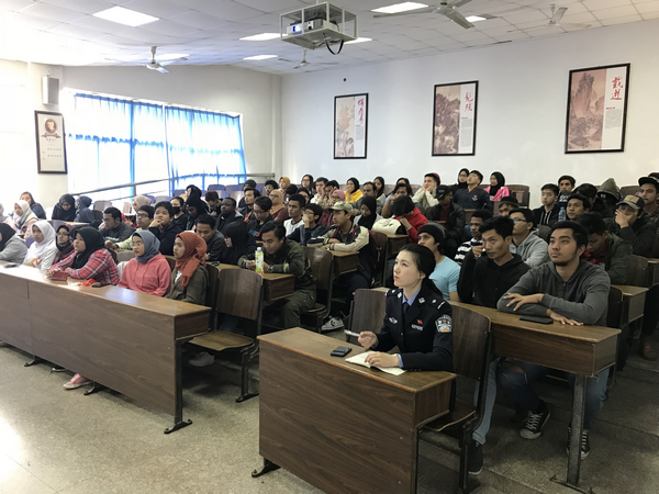 为了增强我校外国留学生的法律法规意识,加大出入境管理法律政策的教育宣传力度,进一步做好外国留学生的日常管理工作,2018年11月27日下午国际教育学院邀请无锡市公安局出入境管理处的李星諓、张莉警官为留学生们开展了“外国留学生法律法规与安全教育”的专题讲座。来自印尼、马来西亚、蒙古、孟加拉、柬埔寨、阿尔及利亚、布隆迪的120余名留学生参加了此次讲座。